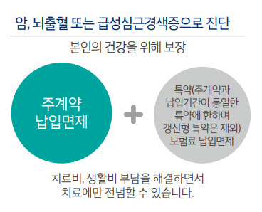 - 3대 질병 진단받을 경우, 주 계약 및 특약 보험료 납입면제 (갱신형 특약 제외)